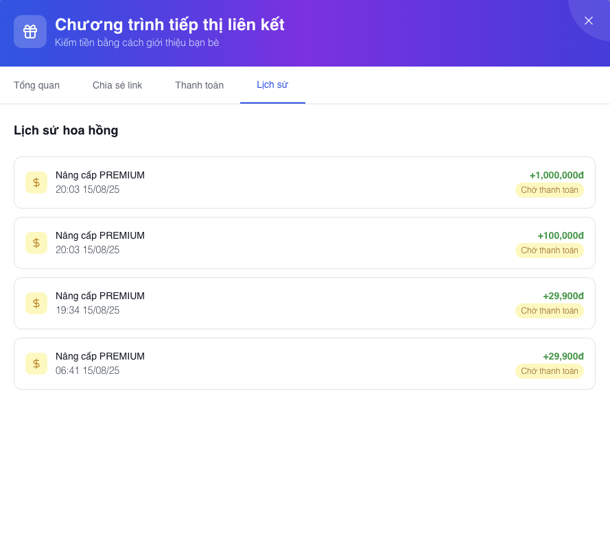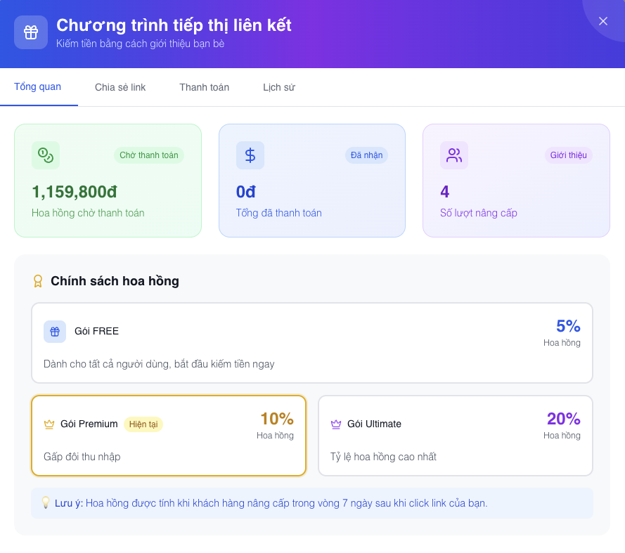 - Bạn sẽ nhận hoa hồng khi người dùng nâng cấp gói trong vòng 7 ngày sau khi mở link của bạn