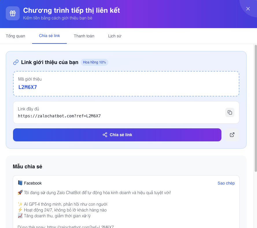 Chương trình Affiliate ZaloChatBot cho phép bạn kiếm hoa hồng bằng cách giới thiệu nền tảng đến các doanh nghiệp và cá nhân khác. Mỗi khi có người nâng cấp dịch vụ qua link giới thiệu của bạn, bạn sẽ nhận được phần trăm hoa hồng hấp dẫn.