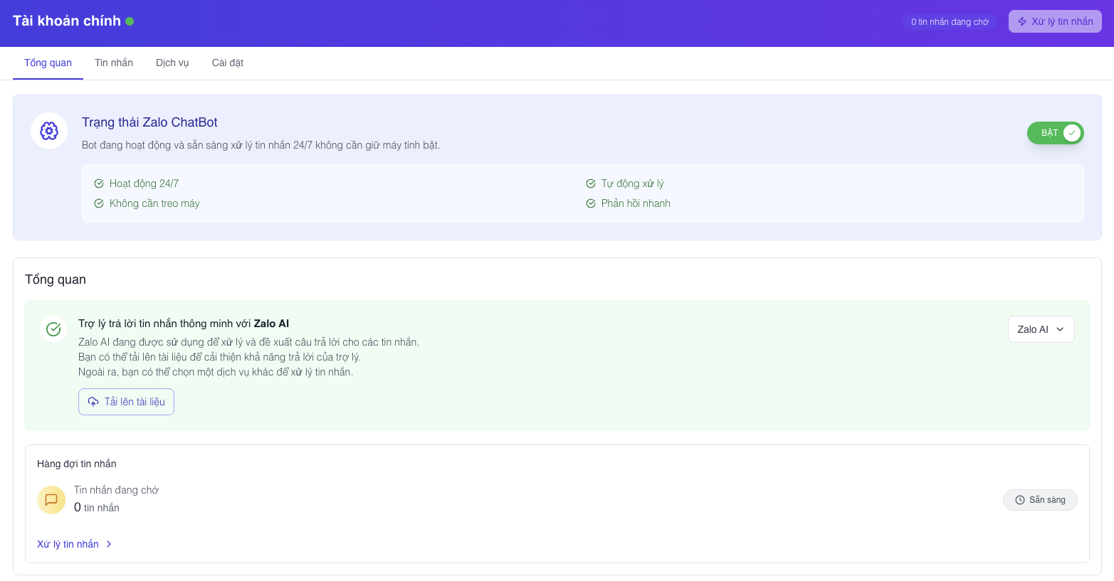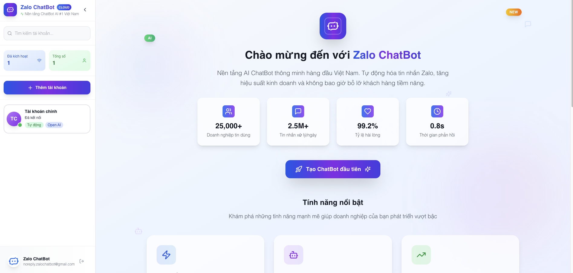 Hướng dẫn này sẽ giúp bạn thiết lập chatbot AI đầu tiên trong vòng 5 phút, từ kết nối Zalo đến cấu hình các tính năng cơ bản.