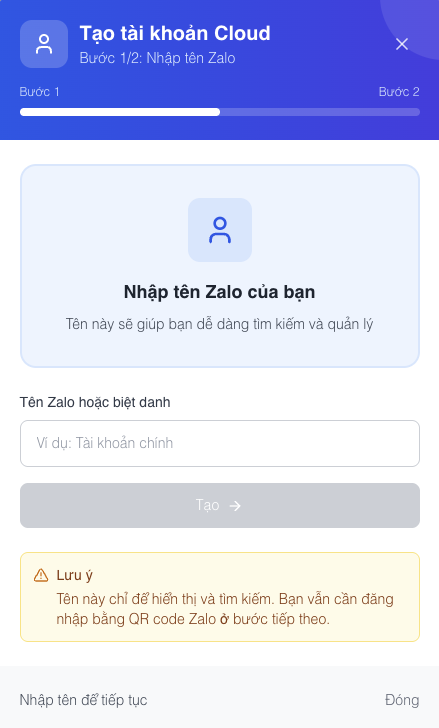 - Nhập tên Zalo của bạn - Đây là tên hiển thị để dễ nhớ và quản lý