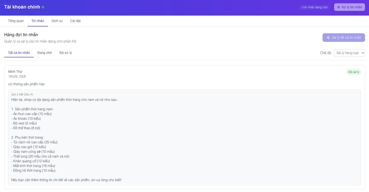 Bây giờ khách hàng có thể nhắn tin cho Zalo của bạn và nhận được phản hồi tự động 24/7