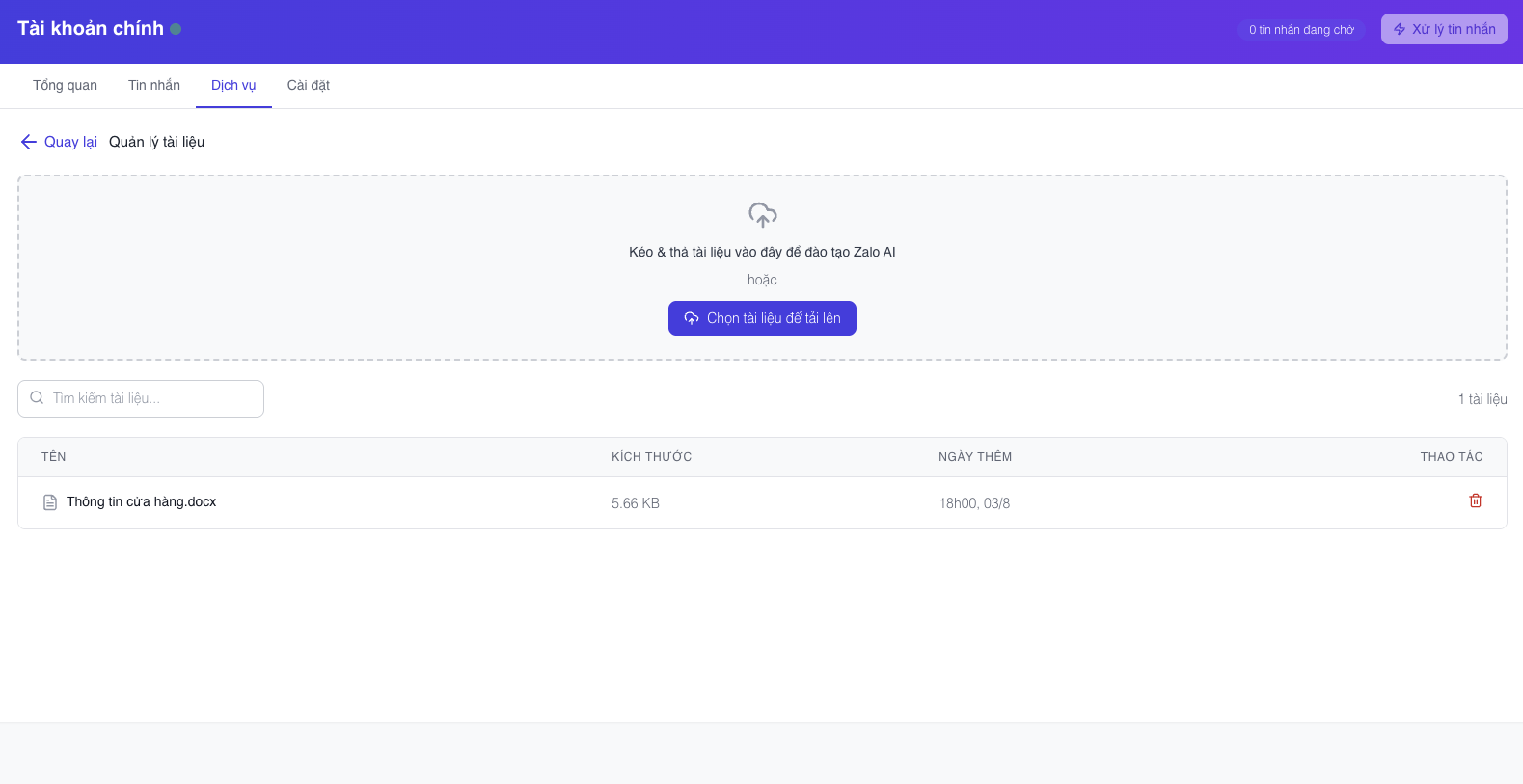 - Tải lên catalog sản phẩm, bảng giá, FAQ