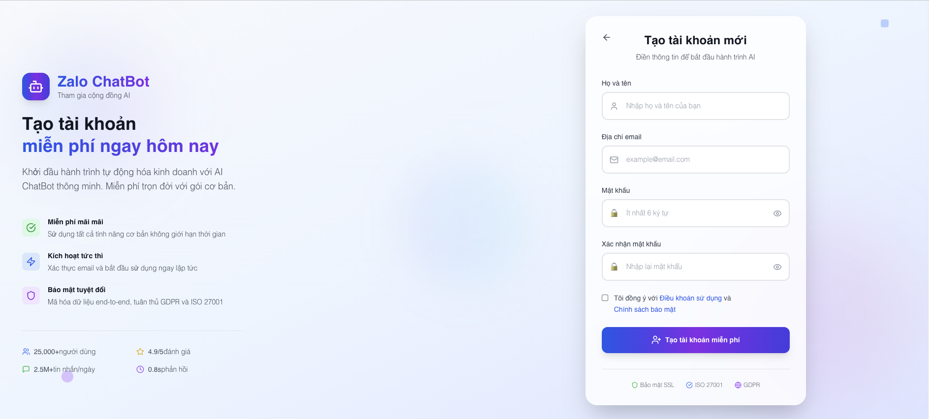 Hướng dẫn tạo tài khoản ZaloChatBot miễn phí để bắt đầu sử dụng AI ChatBot tự động trả lời tin nhắn Zalo 24/7.